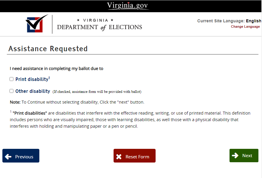 - If you have one of the listed disabilities, select the appropriate option. Otherwise, move to the next page.