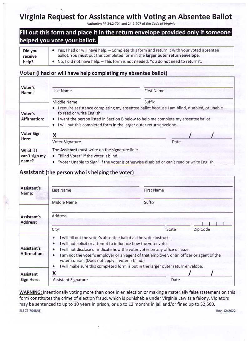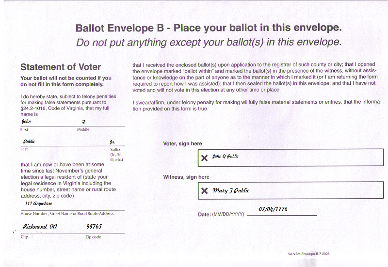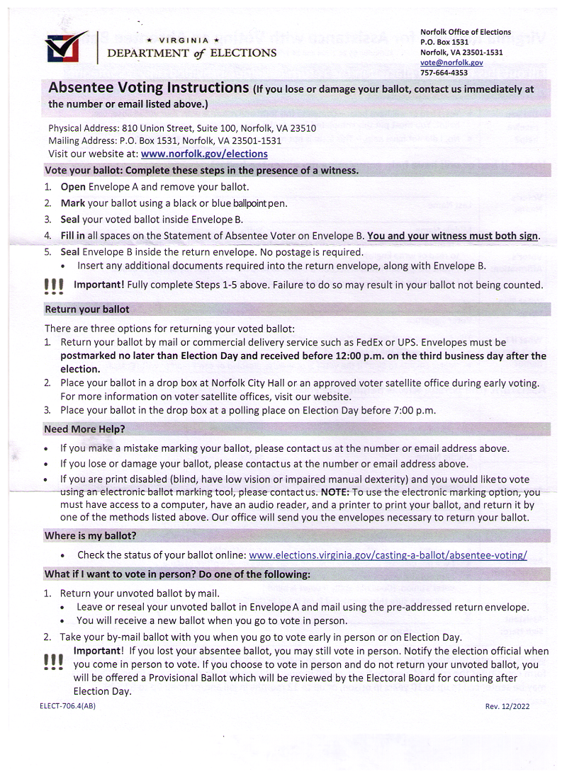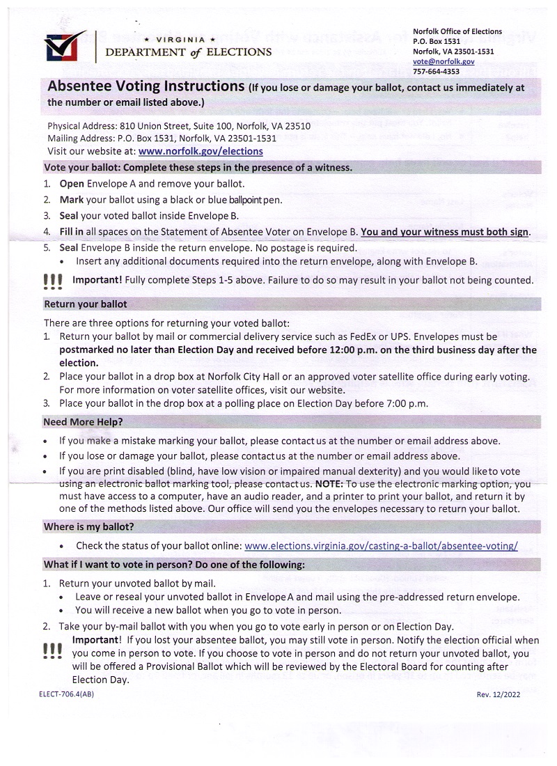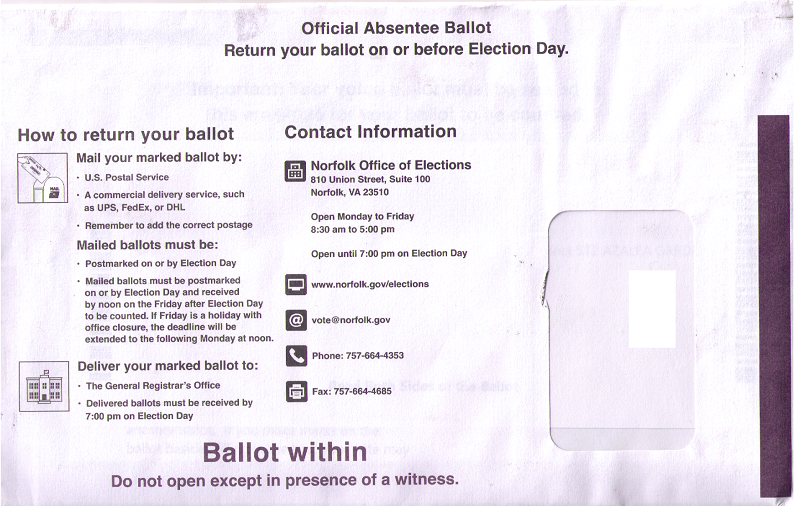 - Effective July 1, 2023, a witness is no longer required when voting an absentee ballot by mail. In lieu of a witness signature, voters must provide the last four digits of their Social Security Number and Year of Birth on Envelope B, along with their voter name, signature, and current Norfolk registered residence address.