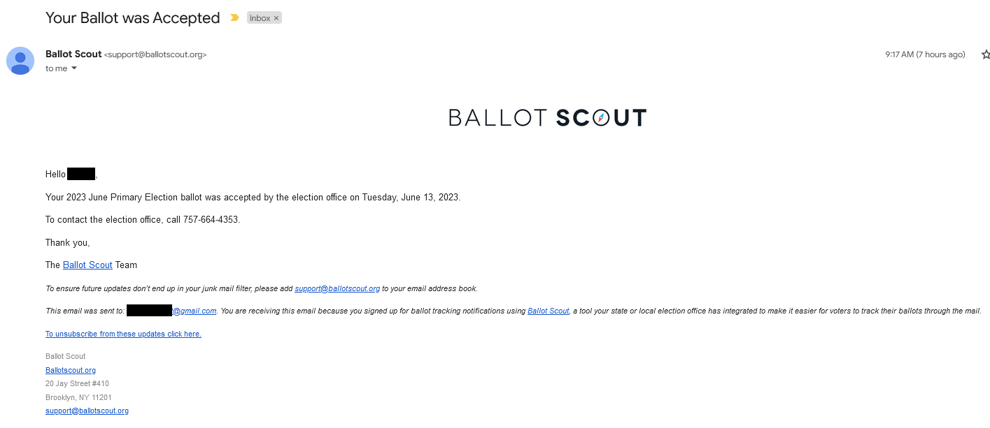 - A few days later, you'll receive a message confirming your ballot has been accepted.